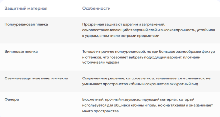 В таблице собрали виды материалов для защиты лифтов с указанием характеристик: